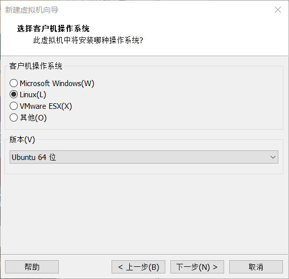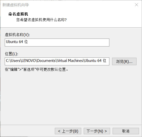 选择“Linux”,版本“Ubuntu 64 位”,进行下一步,命名虚拟机: