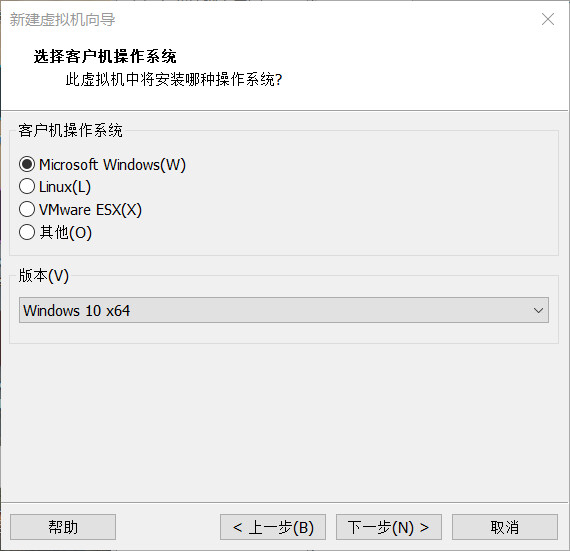 选择“Microsoft Windows”,版本“Windows 10 x64”,进行下一步,安装客户机操作系统: