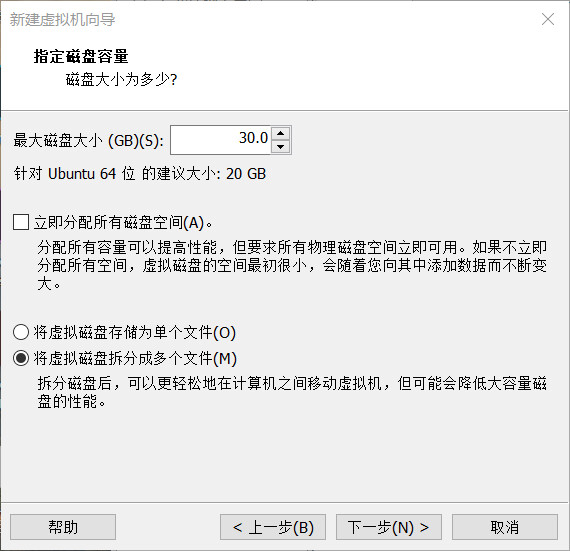 将最大磁盘大小设置为 30.0GB,默认选择“将虚拟磁盘拆分成多个文件”: