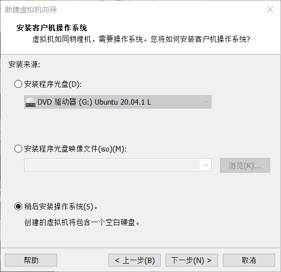 选择“稍后安装操作系统”,进行下一步,选择客户机操作系统: