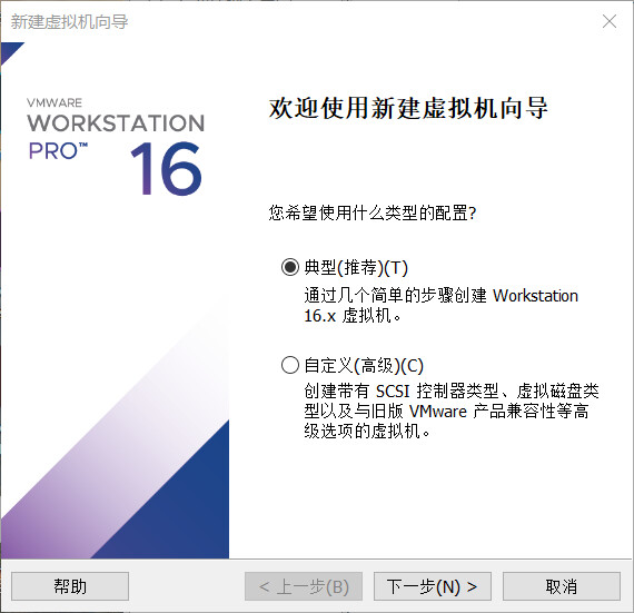 打开 VMware Workstation 16,点击“创建新的虚拟机”,打开新建虚拟机向导: