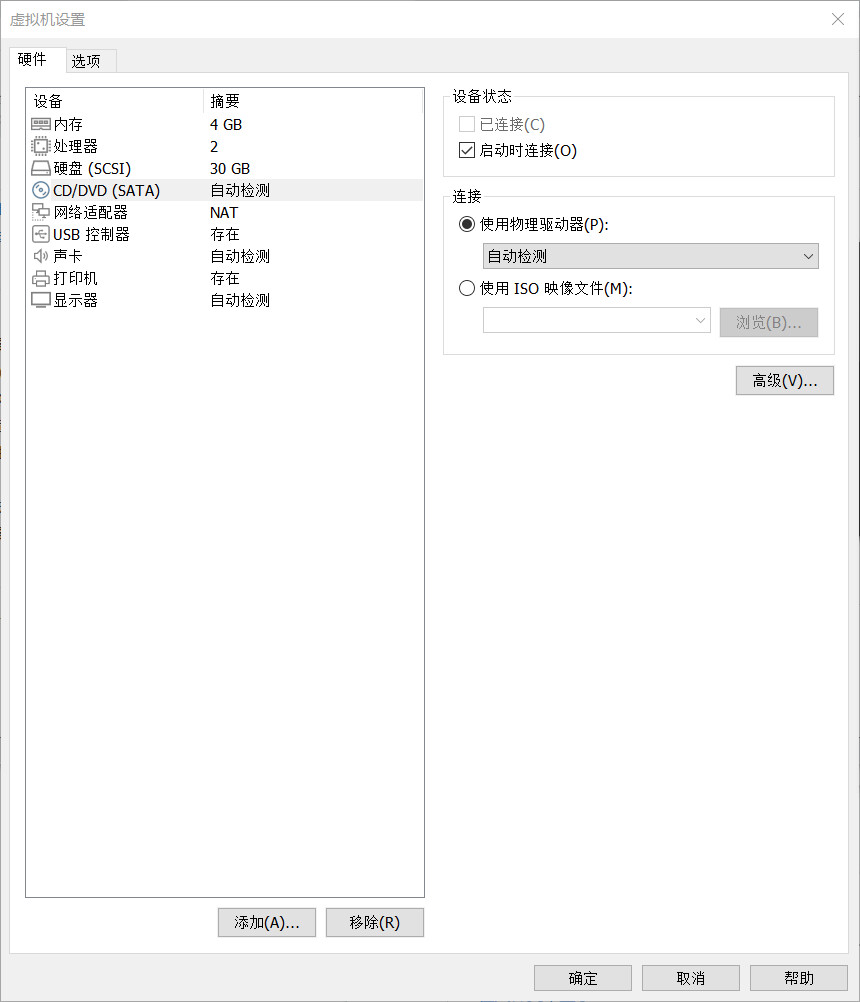 点击“CD/DVD (SATA)”,在右侧“连接”处选择“使用 ISO 映像文件”,选择下载好的 iso 文件: