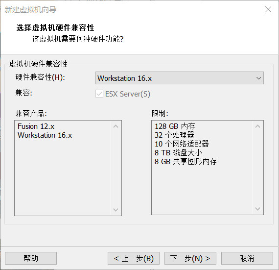选择“自定义(高级)”,继续选择虚拟机硬件兼容性: