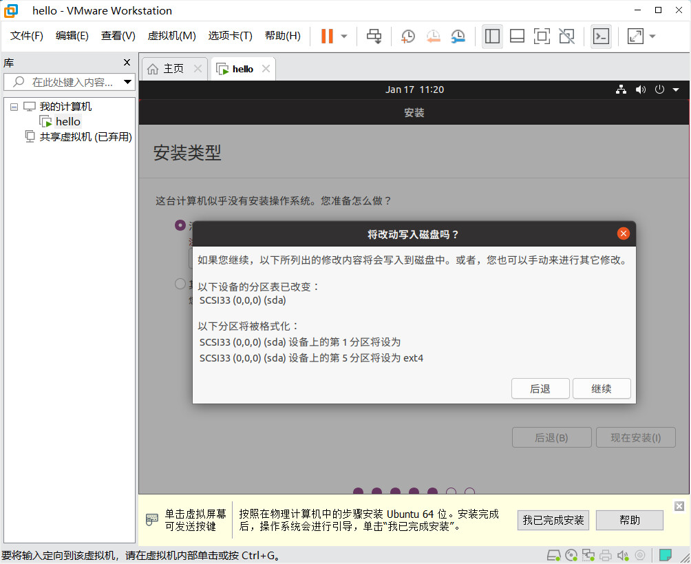 继续,选择安装类型“Erase disk and install Ubuntu”后,继续将改动写入磁盘: